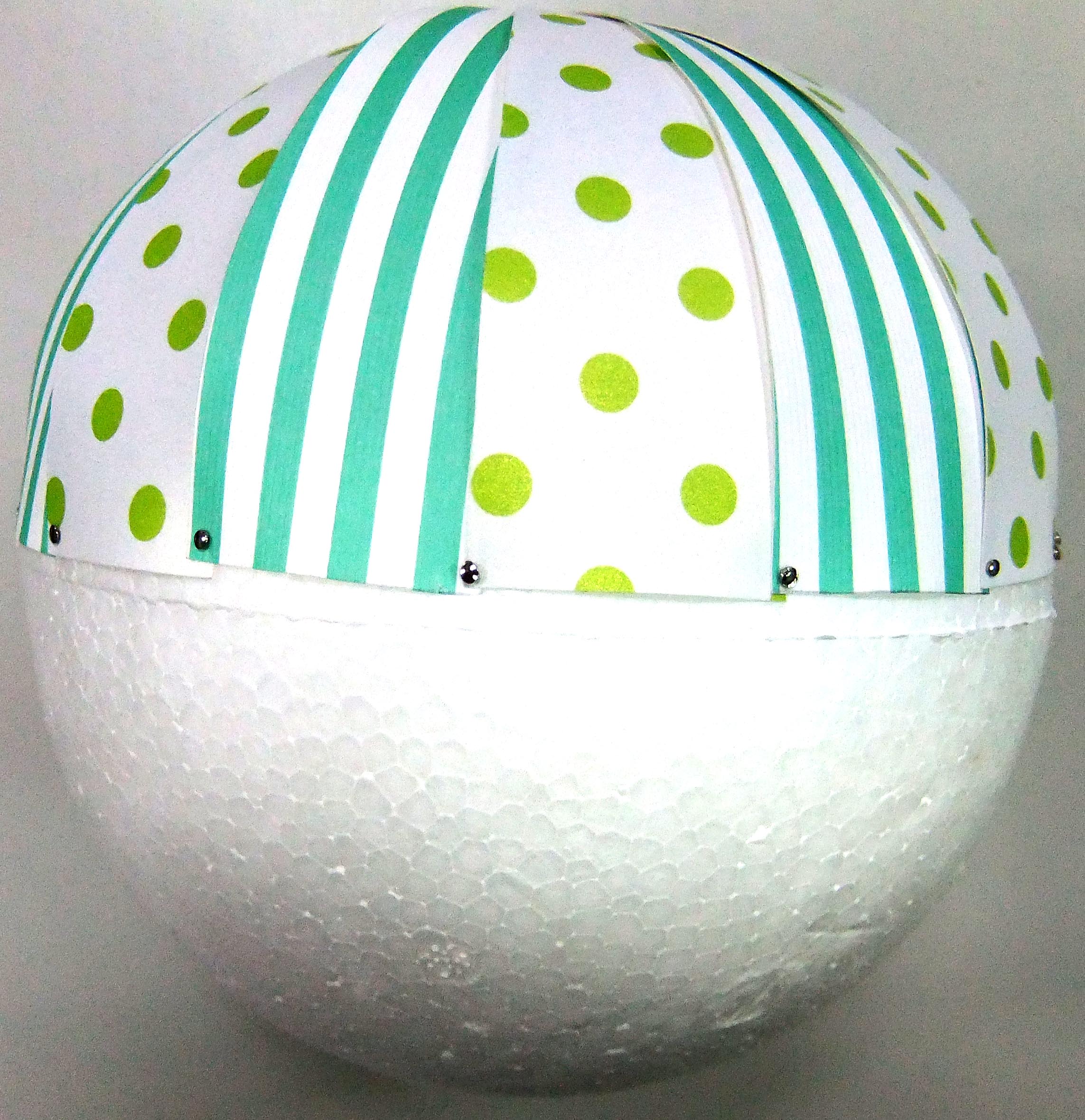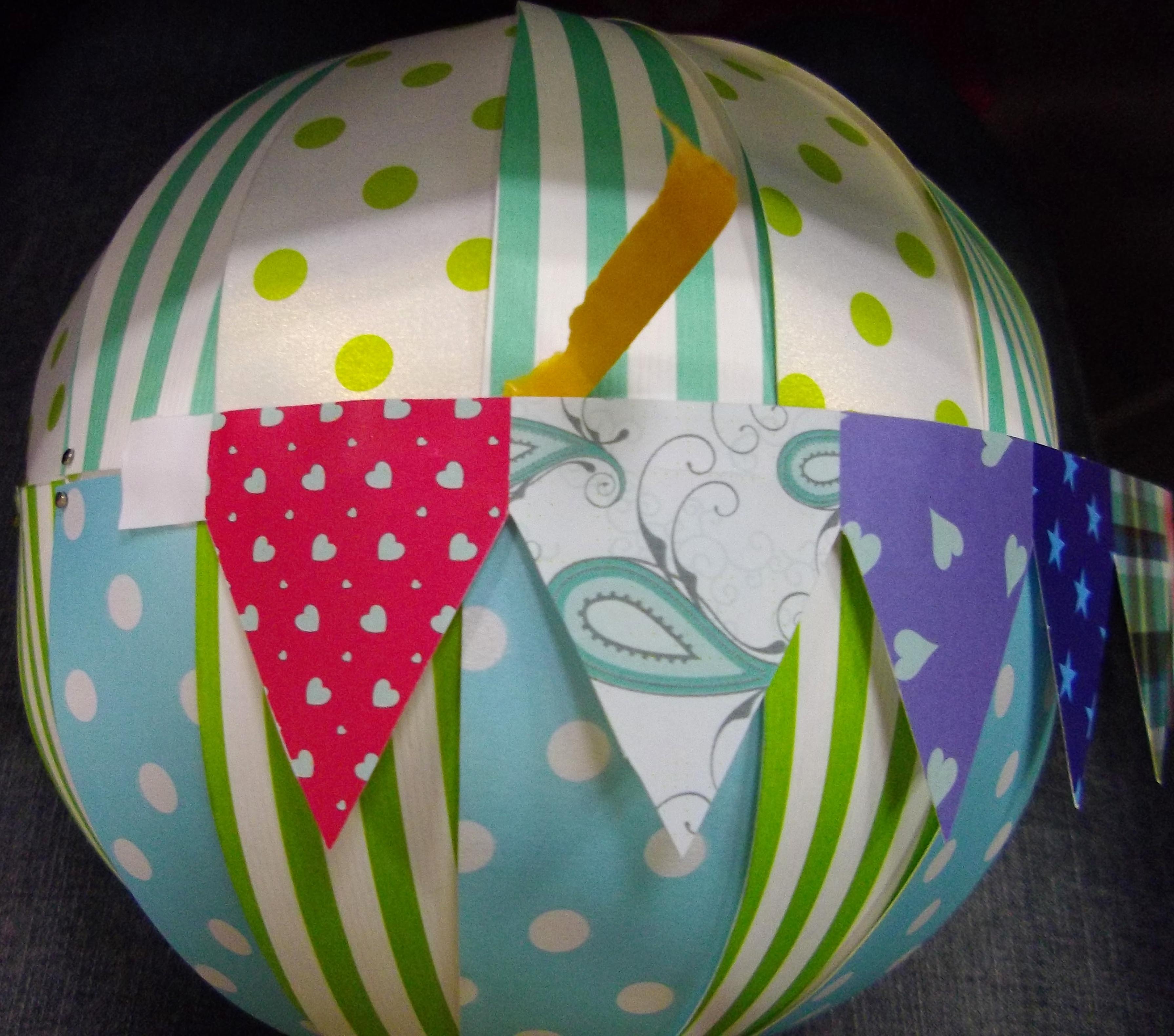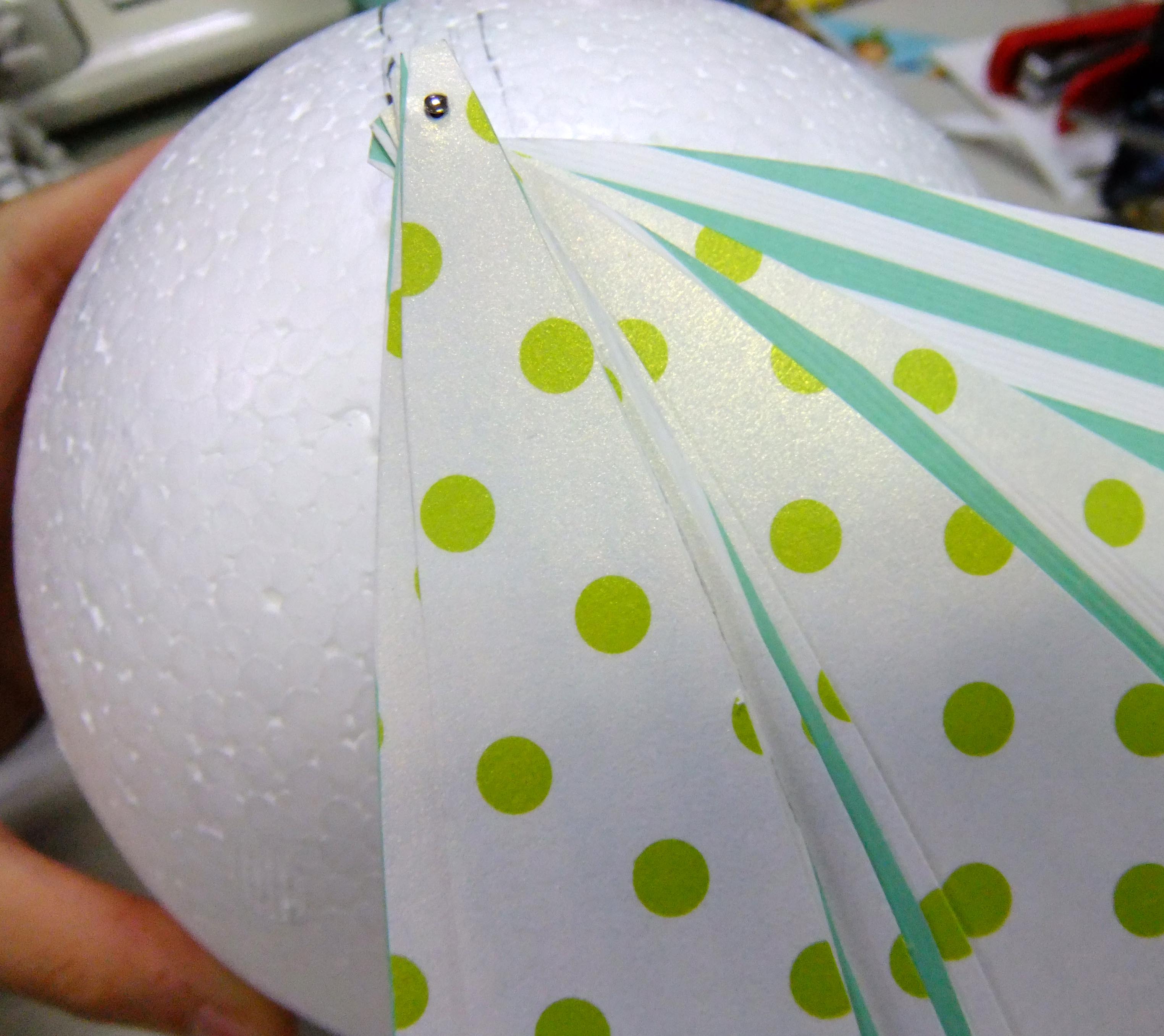 萬國旗跟緞帶都要比對一下,長度要可以繞完保麗龍球再多一點點,免得有空隙