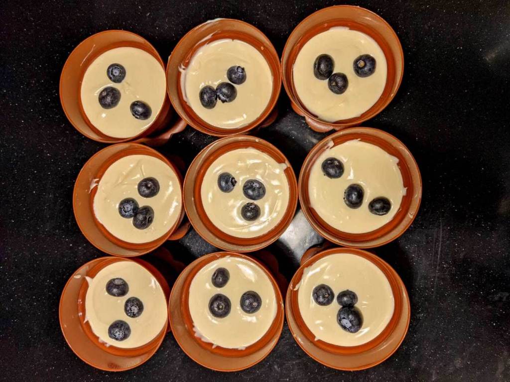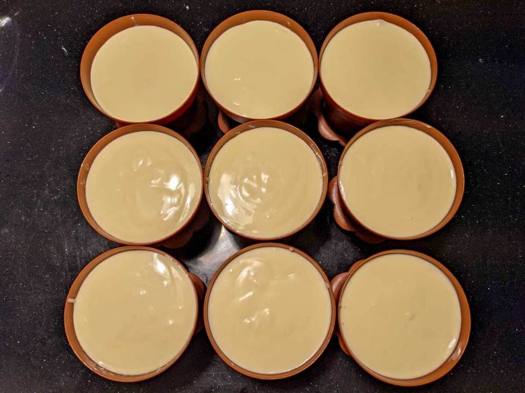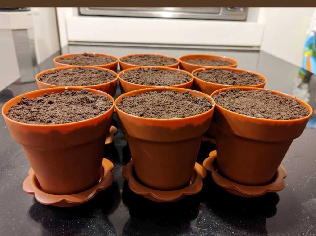 再將剩下的蛋糕糊平均倒在每個盆栽