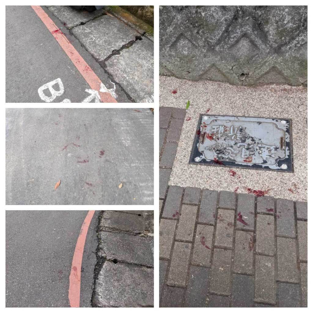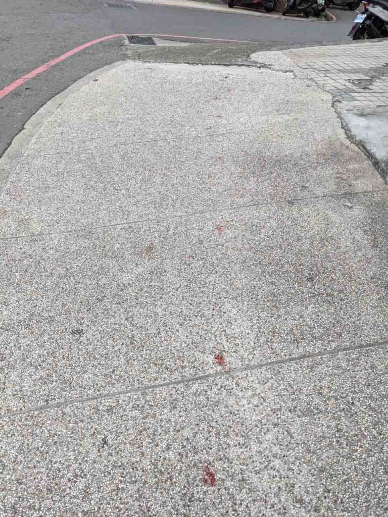 在某個巷口人行道磚上看到紅色檳榔汁